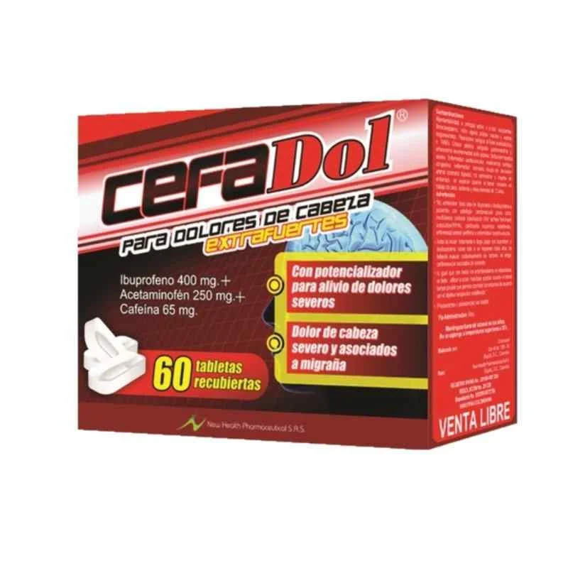 Cefadol Extrafuerte Tabletas es un potente analgésico diseñado para el alivio de dolores de cabeza severos y migrañas. Contiene una fórmula combinada de ibuprofeno, acetaminofén y cafeína, ingredientes que actúan en sinergia para proporcionar un alivio rápido y efectivo. El ibuprofeno y el acetaminofén ayudan a reducir el dolor y la inflamación, mientras que la cafeína potencia la acción analgésica, haciéndolo ideal para momentos de dolor intenso. Cefadol es una excelente opción para quienes buscan una solución eficaz y confiable para dolores persistentes y severos, mejorando su bienestar y calidad de vida.
