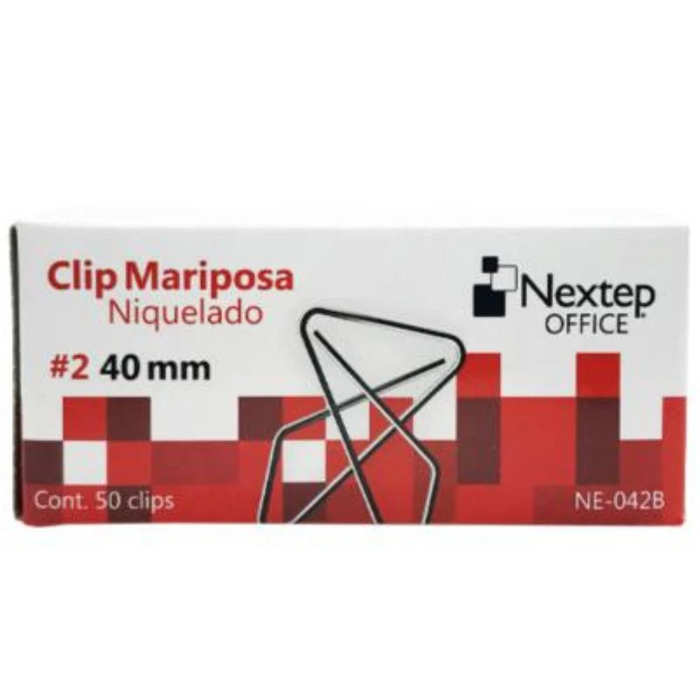 «description»: «Organiza tus documentos con los clips mariposa Nextep niquelados #2 de 40mm. Paquete de 50 clips resistentes y duraderos (modelo NE-042B). Ideales para oficina, escuela y hogar. Sujeción segura y profesional.»,