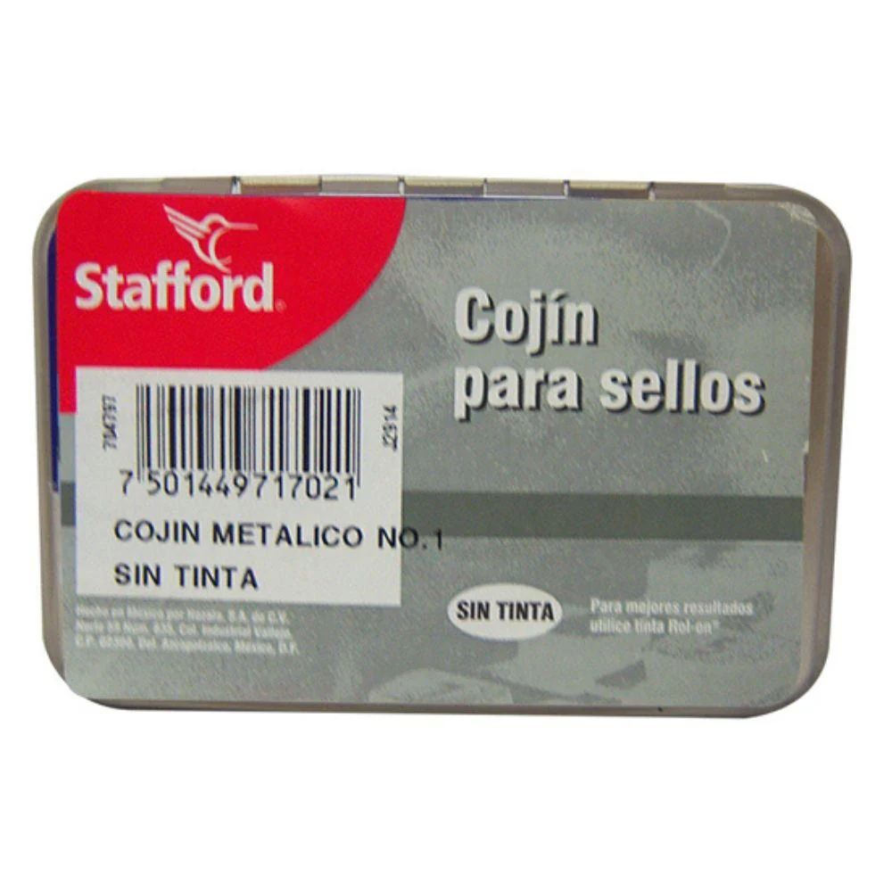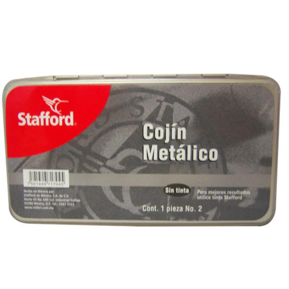Maximiza la vida útil de tus sellos con el **Cojín para Sello Stafford**, la almohadilla de alta calidad que tus documentos merecen. Su robusto **estuche metálico** protege la almohadilla de la suciedad y el deterioro, asegurando un uso prolongado y un sellado impecable cada vez.