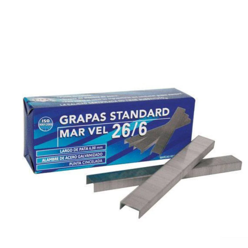 «description»: «Caja de grapas estándar 26/6 Marvel, con 5,040 unidades de acero electro-galvanizado. Capacidad para 25 hojas, ideal para uso de alto volumen en oficina y escuela.»,