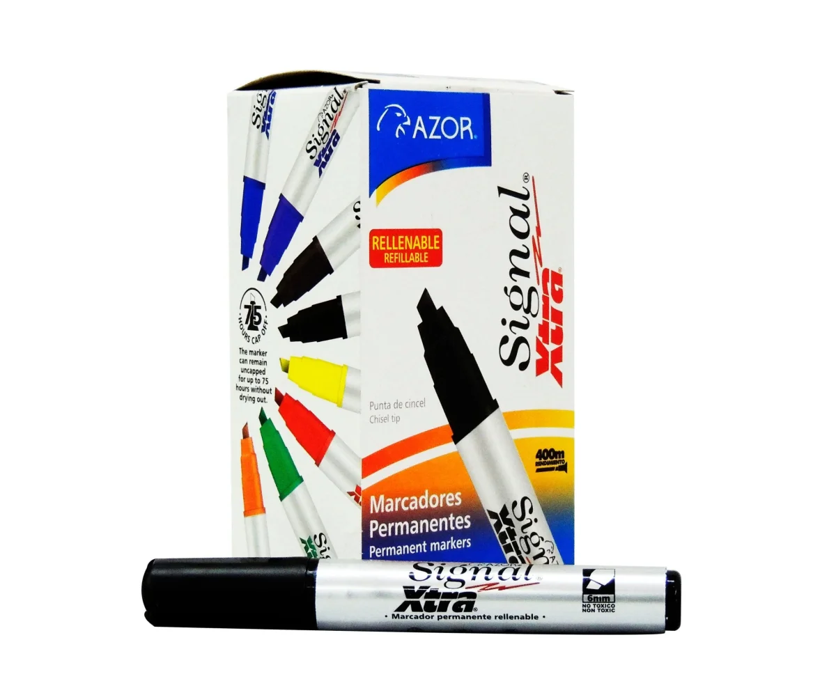 Marcador permanente Xtra Signal con tinta a base de alcohol, punta cincel de 6 mm y diseño resistente. Ideal para marcaje industrial, escolar o de oficina. Rellenable y duradero, con excelente rendimiento sobre diversas superficies.