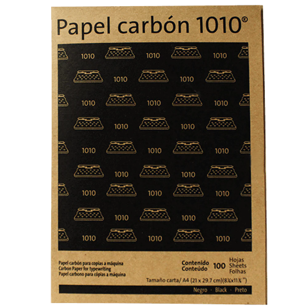 «description»: «Papel carbón Pelikan 1010, paquete con 100 hojas de tinta base cera. Ideal para hacer copias claras de documentos tamaño carta y oficio.»,