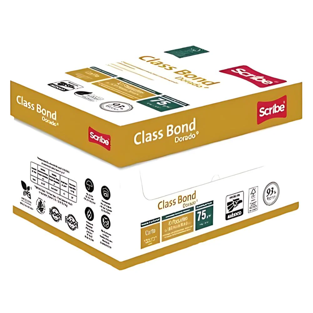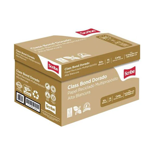 El **Papel Scribe Class Bond Dorado** es la opción profesional para tu oficina o negocio que exige rendimiento a gran escala. Esta **Caja con 5,000 hojas** de tamaño **Carta** ofrece una **blancura óptima (92%)** y un gramaje de **75 gramos**, ideal para impresiones nítidas y de alta calidad. ¡Compra por volumen y asegura tu suministro!
