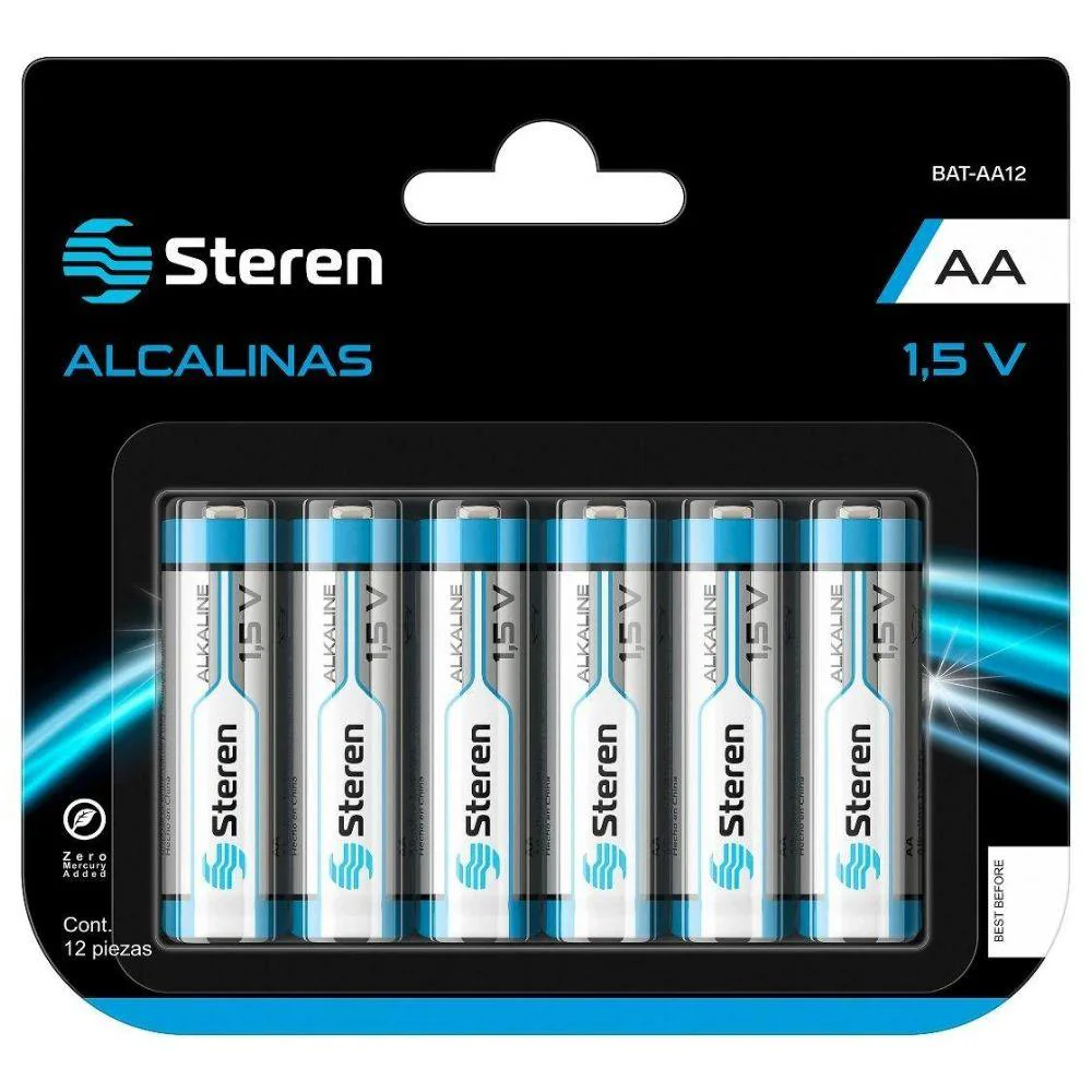 Pilas Alcalinas Tamaño Aa Marca Steren Paquete Con 12 Piezas. Voltaje: 1.5 Vcc. Libres De Mercurio Y Cadmio. Dimensiones: 5 Cm De Alto X 1.4 Cm De Diámetro. Para Uso General.