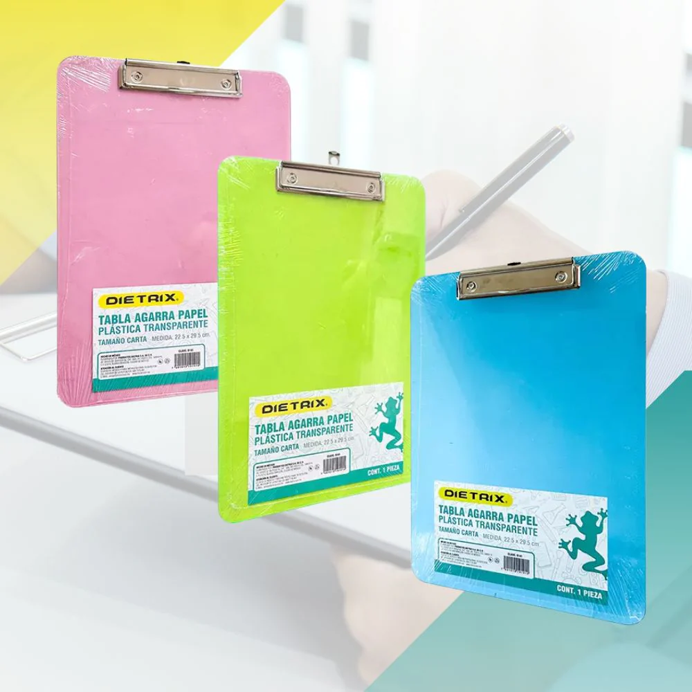 Organiza y escribe cómodamente en cualquier lugar con la tabla sujetapapel DIETRIX. Fabricada en plástico resistente, su tamaño carta y diseño transparente con regla integrada la hacen ideal para la escuela, oficina o tareas de campo. ¡Ligera, práctica y funcional!
